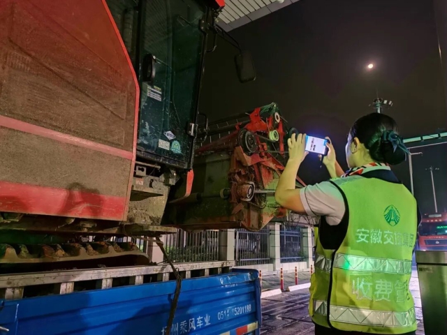 合蕪中心柘皋站收費員快速查驗跨區(qū)作業(yè)收割機