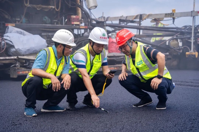 建設公司天天項目辦質安部工作人員在施工現場檢查路面上面層施工質量