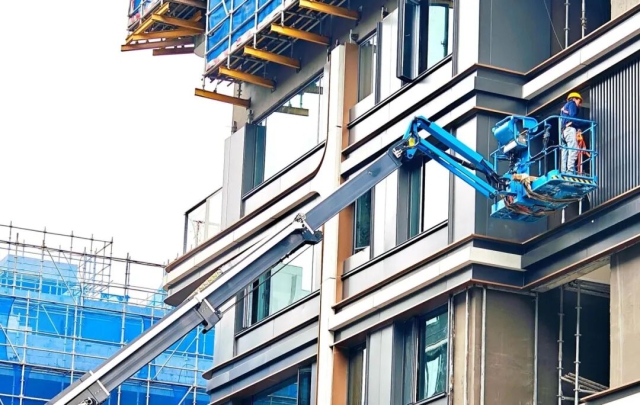 交控建工集團濱科城項目工人進行外幕墻鋁板安裝施工