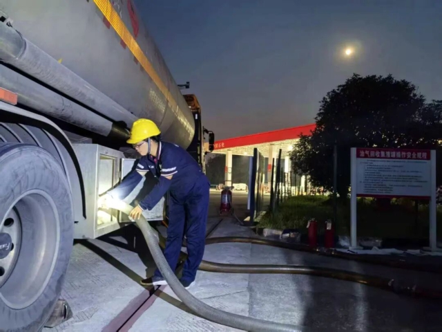 石化公司潛山加油站員工正在卸油