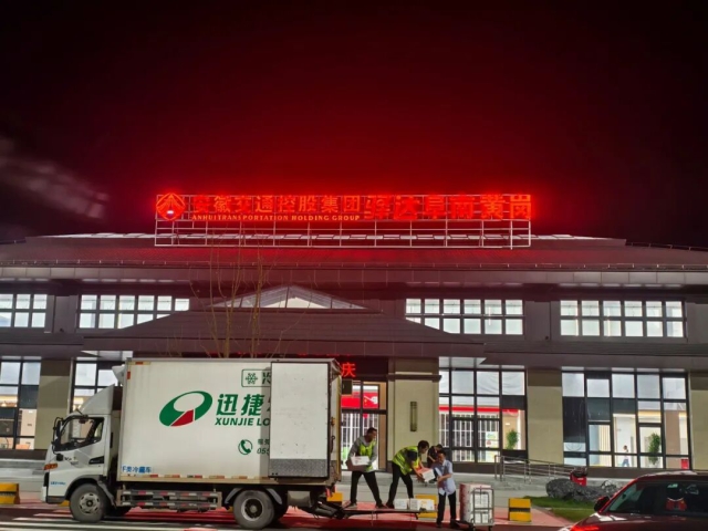 迅捷物流公司冷鏈倉配一體化項目配送人員在服務區(qū)為客戶配送冷凍產品